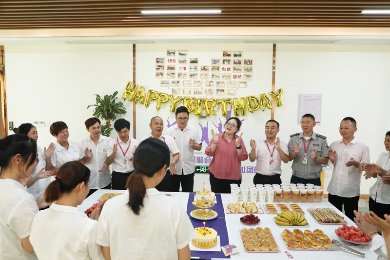香甜的生日蛋糕,丰富的水果点心,寿星们欢聚一堂,言语中无不透露着家人般的温暖和关怀,一句句真诚的问候,一声声来自同事的祝福,“寿星们”脸上洋溢着幸福的笑容,伴随着欢快的生日祝歌,大家一同许下生日愿望。